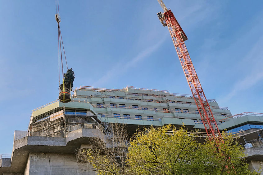 Drei Bergkiefern und ein Säulenwacholder wurden an ihren Platz an der Südwestseite des Bunkers auf St. Pauli gesetzt. Doch das Megaprojekt in der Hamburger Feldstraße ist damit noch lange nicht abgeschlossen.