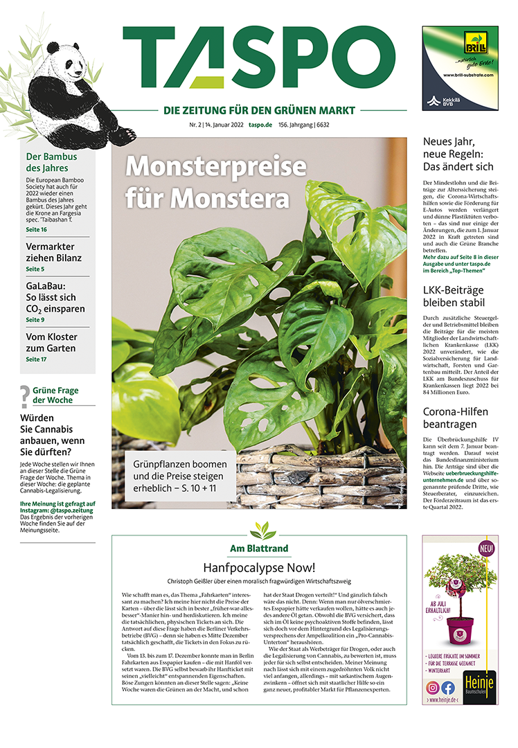 1867 erstmalig erschienen, ist die TASPO die älteste und auflagenstärkste Wochenzeitung für den gesamten grünen Markt. Dabei berichten wir jede Woche ausführlich aus allen Fachbereichen. Regelmäßige Specials informieren unsere Leser nicht nur über neue Sorten, sondern auch über die Entwicklungen in den Bereichen Gartencenter und GaLaBau. Das TASPO Messejournal, das TASPO Dossier und der TASPO Newsletter runden unser umfangreiche Informationsangebot ab. So verpassen Sie garantiert nichts, was die Grüne Branche bewegt!